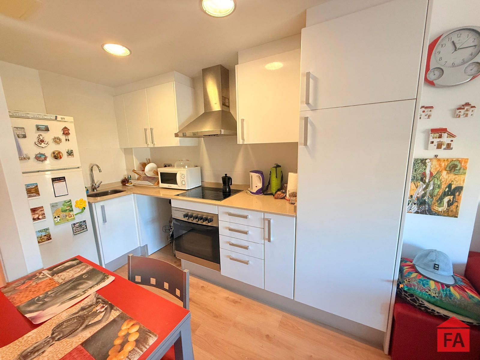 La vivienda dispone de un acogedor salón-comedor con cocina americana perfectamente integrada, un ambiente abierto y funcional que destaca por su luz natural. Desde esta estancia se accede a un balcón exterior, ideal para disfrutar de un respiro al aire libre.