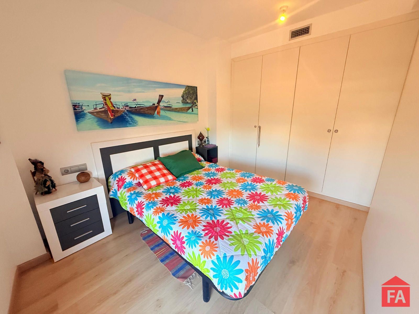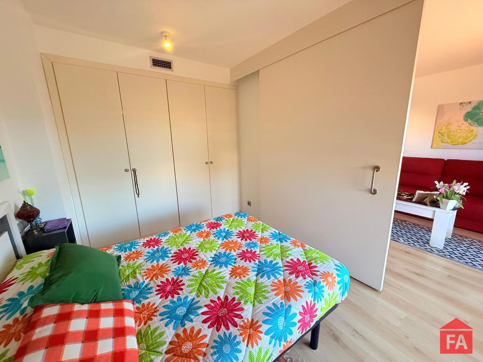 La habitación, equipada con armario empotrado y puerta corredera, garantiza un espacio práctico y bien aprovechado.