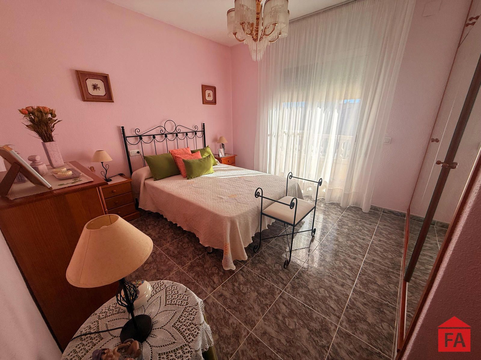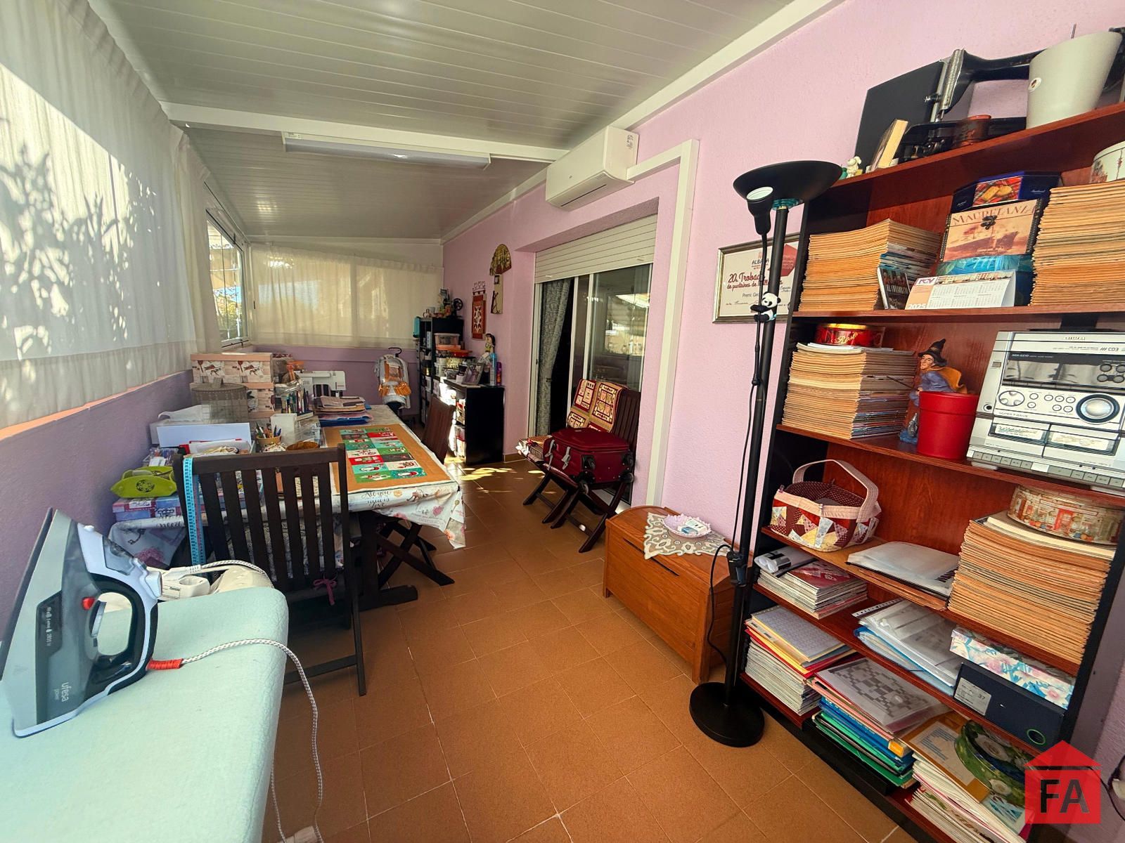 Esta adosada de tres alturas se distribuye en una primera planta con un gran salón comedor con salida a una terraza cerrada con aluminio y aire acondicionado calor/frío con ventanas plegables que pueden abrirse completamente. En la misma planta nos encontramos con la cocina, muy grande conectada al lavadero. También tenemos una habitación doble con acceso a un baño completo.
